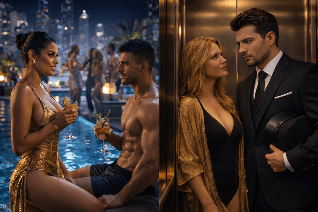 Omar remained seated by the pool, his body turned slightly to catch the best angle of the sun. He sipped his cocktail with the precision of someone fully aware of how he looked doing it. A slow gesture, theatrical but practiced. Then came the smile – too white to be real, too perfect to be cheap. When Maraya approached, the introduction was brief but rehearsed. His handshake was just firm enough, his gaze lingering the exact second required to seem intrigued but not inappropriate. Everything about him felt airbrushed—broad shoulders, sculpted arms, and a frame that spoke of more hours in the gym than in any library. His grooming was meticulous—the kind that took intention, and the quiet confidence of someone who knew exactly what effect he had. And while the effect was technically attractive, Maraya couldn’t shake the sense that she was meeting a very handsome mannequin programmed to flirt.